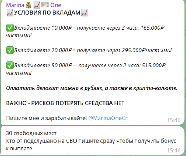 Владелица телеграмм-канала Marina One предлагает участникам своей телеграмм-группы переводить ей деньги, обещая вернуть их через пару часов с огромной прибылью. Например, инвестировавшим 10 000 рублей «Марина Ван» обязуется выплатить аж 165 тысяч. То есть принести прибыль в 1650%.