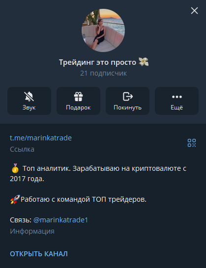 Частью информации о себе девушка делится прямо в описании группы Трейдинг это Просто. По ее словам, она “топ-аналитик” и зарабатывает на крипте с 2017-го года. На деле абсолютно ничем это не подтверждается. Мы даже не уверены, что данная личность хоть как-то связана с торговлей: в канале о ней нет никакой информации.