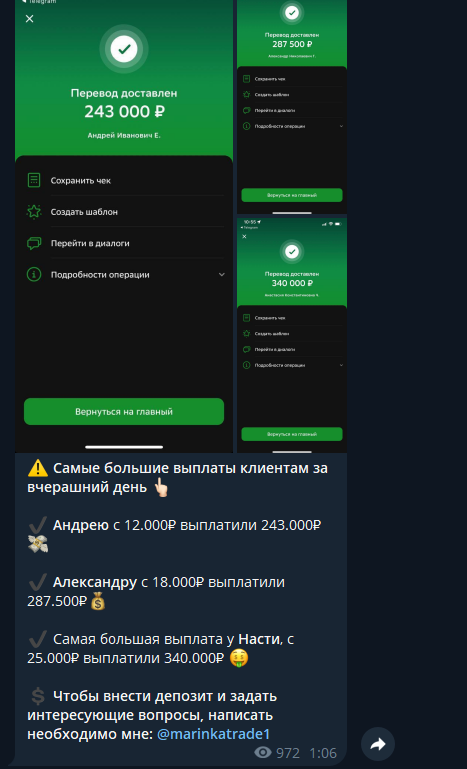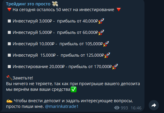 Администратор заявляет, что при инвестиции клиент ничего не теряет, ведь при неудаче ему возвращают деньги. Вот только никаких подтверждений этому нет, да и в целом все гарантии ограничиваются скриншотами банковских переводов или диалогов. И то, и другое подделывается максимально просто.
