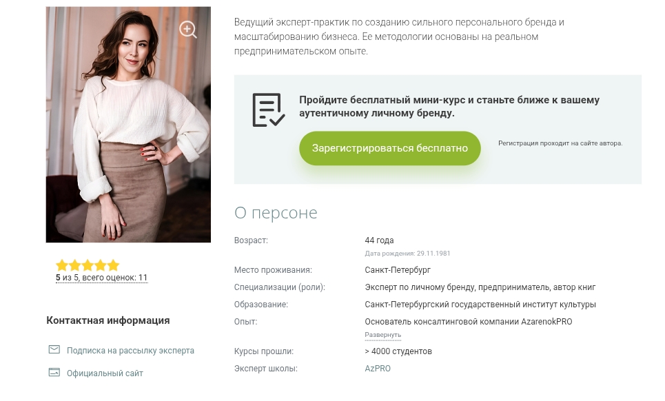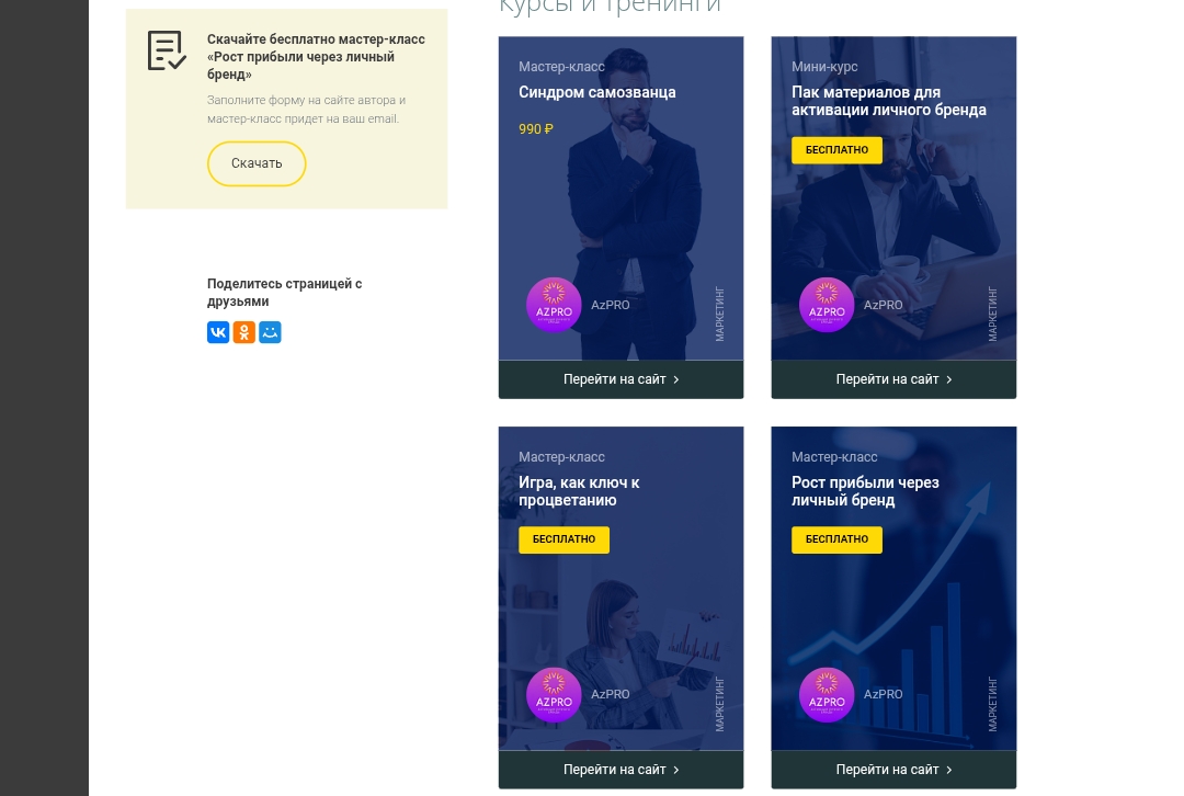На сайте Марии Азаренок больше десяти продуктов: короткие вебинары, средние интенсивы и трехмесячные программы. Темы касаются синдрома самозванца, построения личного бренда, доверительного маркетинга, упаковки экспертности. Материалы остаются в личном кабинете, поэтому ученики могут возвращаться к урокам без ограничения по времени.