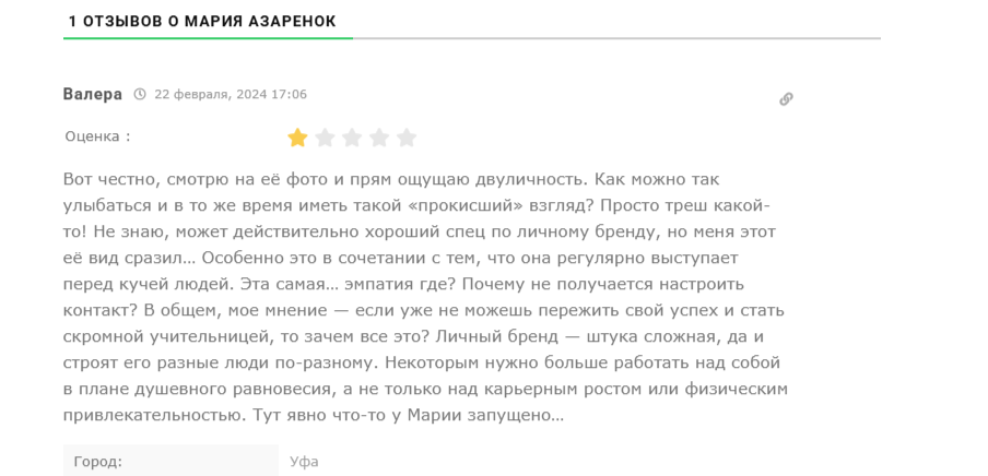 Замечена парадоксальная картина: рейтинг сервиса на независимых площадках держится на уровне 1.4 балла при заявленных сотнях выпускников, тогда как на сайте самой Марии рейтинг стоит на 5 баллах без единого негативного или нейтрального отзыва. Такое расхождение говорит о жесткой фильтрации обратной связи на каналах Марии Азаренок, из-за чего потенциальным клиентам сложно составить объективное впечатление.