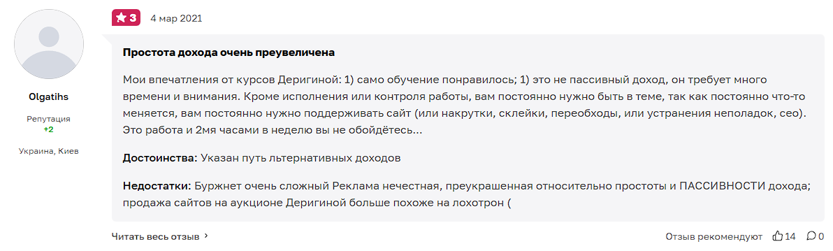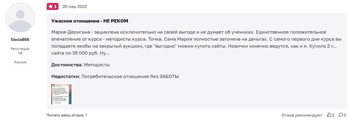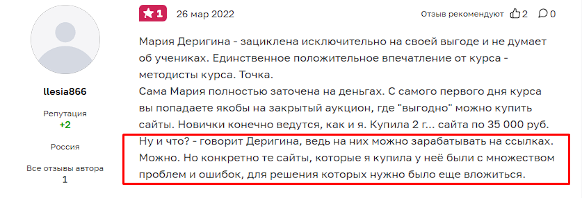 Пользователи делятся негативными отзывами по итогам прохождения курсов KursRaketaMariaDerigina. Люди заявляют, что некоторые материалы являются полезными, но обещания Марии крайне преувеличены. Заработать на сайтах за 2 часа в неделю невозможно, аукцион является обманом, там команда продает ресурсы низкого качества по завышенному ценнику. Также людям отказывают в возврате средств до его прохождения, а минимальная цена уроков начинается от 80 тысяч рублей.