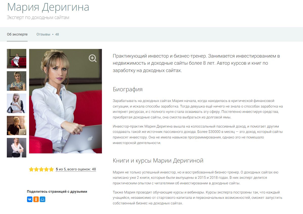 Там также есть пустые формулировки, типа “поборола свои страхи и научилась достигать цели”, но рассматривать их смысла нет. Вдобавок оценить достоверность других фактов невозможно, да, у Марии есть некоторая дорогая недвижимость или прочие объекты. Но точно ли она купила их благодаря своим успехам в бизнесе? Может Derigina просто продала курсы Dohodnie Sajty и уроки более чем тысяче наивных пользователей. Такой вариант нельзя исключать, ведь никакой прозрачной статистики/источников дохода нет.