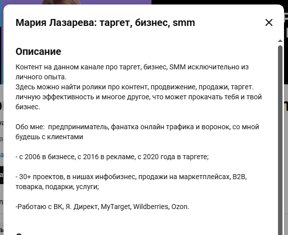 В открытых источниках о Марии данных почти нет. На своем YouTube-канале она называет себя предпринимателем, специалистом по трафику и воронкам, обещает клиентов любому новичку. Утверждает, что в бизнесе с 2006-го, с 2016-го — в рекламе, с 2020-го — в таргетинге. Направления — инфобизнес и селлеры. Говорит о 30 реализованных проектах, но ничем не подтверждает свои слова.