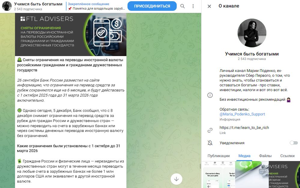 У Марии несколько ресурсов. Канал Учимся быть богатыми, @ learn to be rich, собрал 2,5 тыс.подписчиков. Сообщество посвящено инвестициям, ставкам и налогам, а также другим релевантным темам. Просмотр записей соответствует общей аудитории, комментарии закрыты.