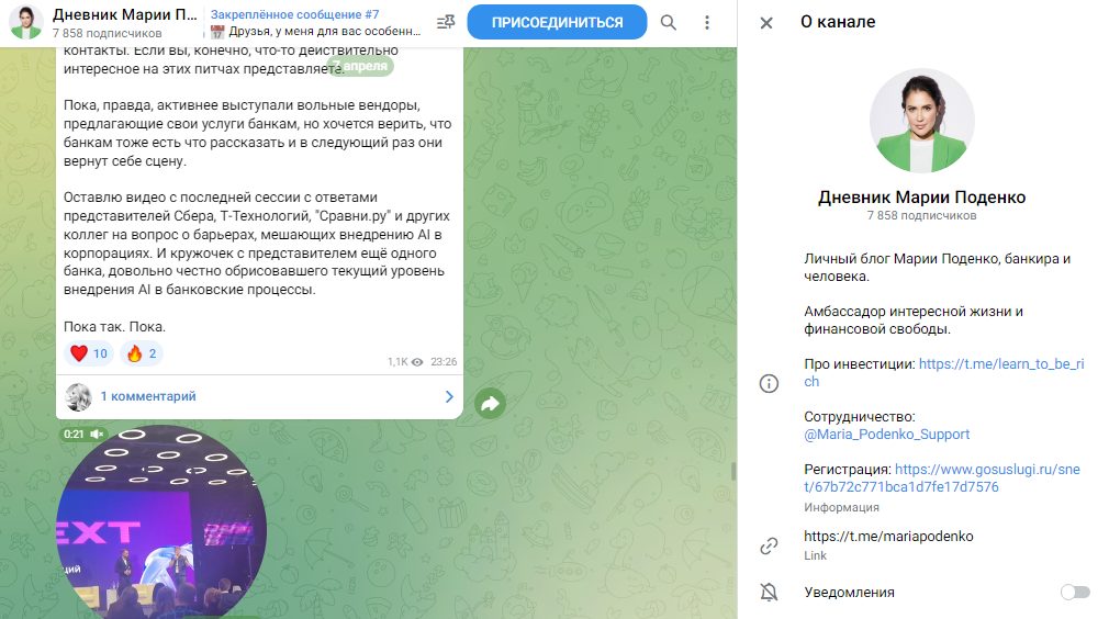 - Мария ведет несколько новостных блогов в Телеграмм, один — личный, другой — с уклоном в бизнес-сферу;