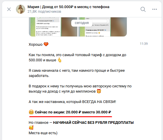 Свои курсы коуч продает через группу в ВК. Потенциальный ученик для их покупки должен написать ей в личные сообщения. Мы проверили и выяснили, что там отвечает робот, а не сама Мария. Бот сообщает, что мест осталось мало и нужно поторопиться. Он же озвучивается стоимость обучения — 20 тыс. руб.