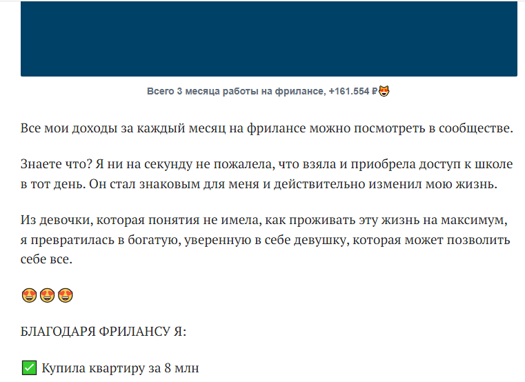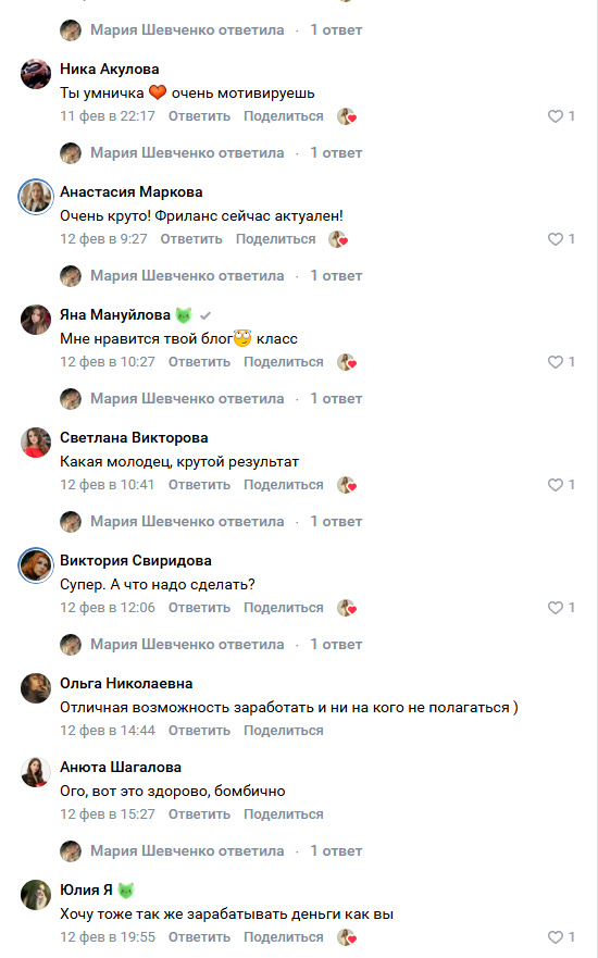 В паблике в ВК Мария рассказывает о своем жизненном пути. Весь текст — это набор нарративов в стиле инфобизнеса, где автор говорит, как фриланс помог ей купить квартиру, машину и дорогие вещи. Свое повествование Шевченко сопровождает фотографиями и скриншотами банковских переводов. При этом она не раскрывает, чем именно занимается.
