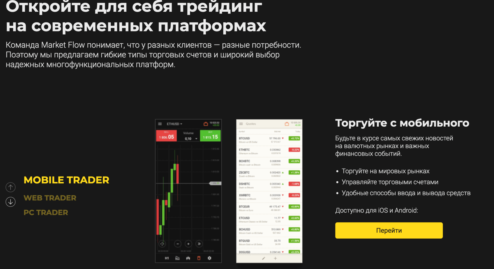 На мониторе всё выглядело стандартно для индустрии. Пользователи могли торговать на MarketFlow такими активами как криптой, металлами и т.д.