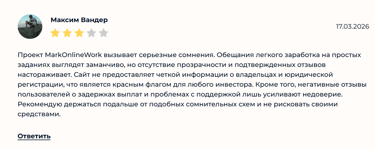 Еще один пользователь пишет, что у трейдера был сайт, но на нем не было документов или информации о владельцах и регистрации. Он изучил отзывы в интернете и понял, что метод заработка, который предлагает трейдер @MarkOnlineWork, заведомо мошеннический и не стал с ним работать.