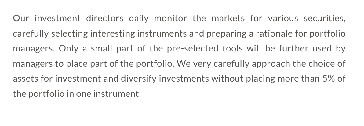 • Опыт специалистов до 12 лет — так как данных о сотрудниках нет, нельзя проверить и информацию об их квалификации в инвестиционной сфере;