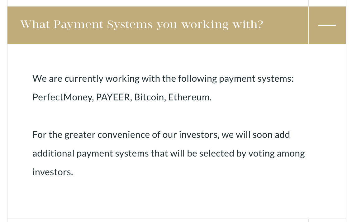 Для сокрытия своей личности создатели скама отказались от использования традиционных платежных инструментов. Они предлагали вносить деньги с электронных кошельков PerfectMoney или PAYEER, а также в криптовалюте BTC или ETH.