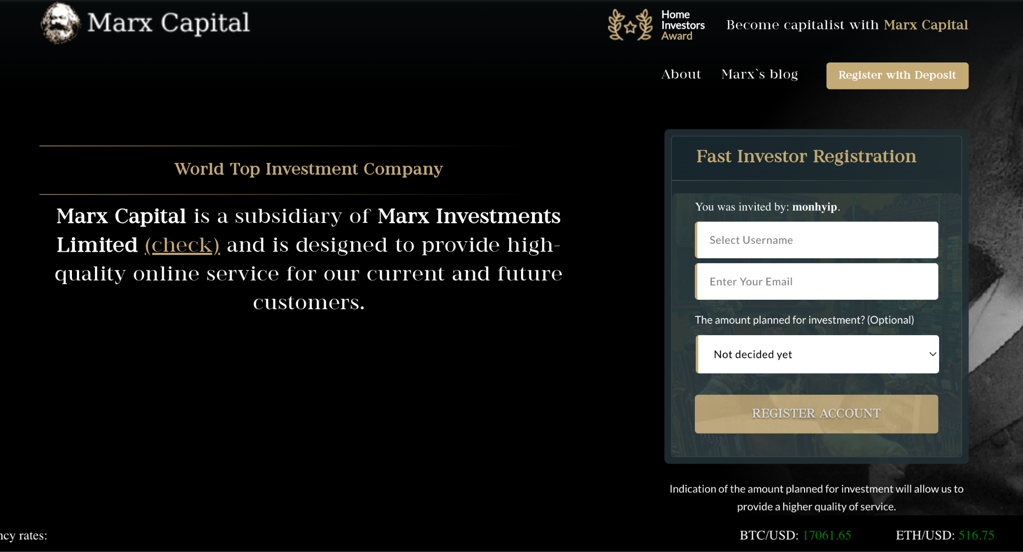 Проект Marxcapital Org при беглом изучении выглядит как инвестиционная платформа, где можно получать доход за счет размещения свободных средств. Представители конторы якобы покупают за них надежные ценные бумаги, которые приносят прибыль. На самом деле перед нами — пирамида, организаторы которой активно завлекали «хомяков» в 2020 году, а потом испарились с деньгами вкладчиков, не оставив после себя даже функционирующего сайта.