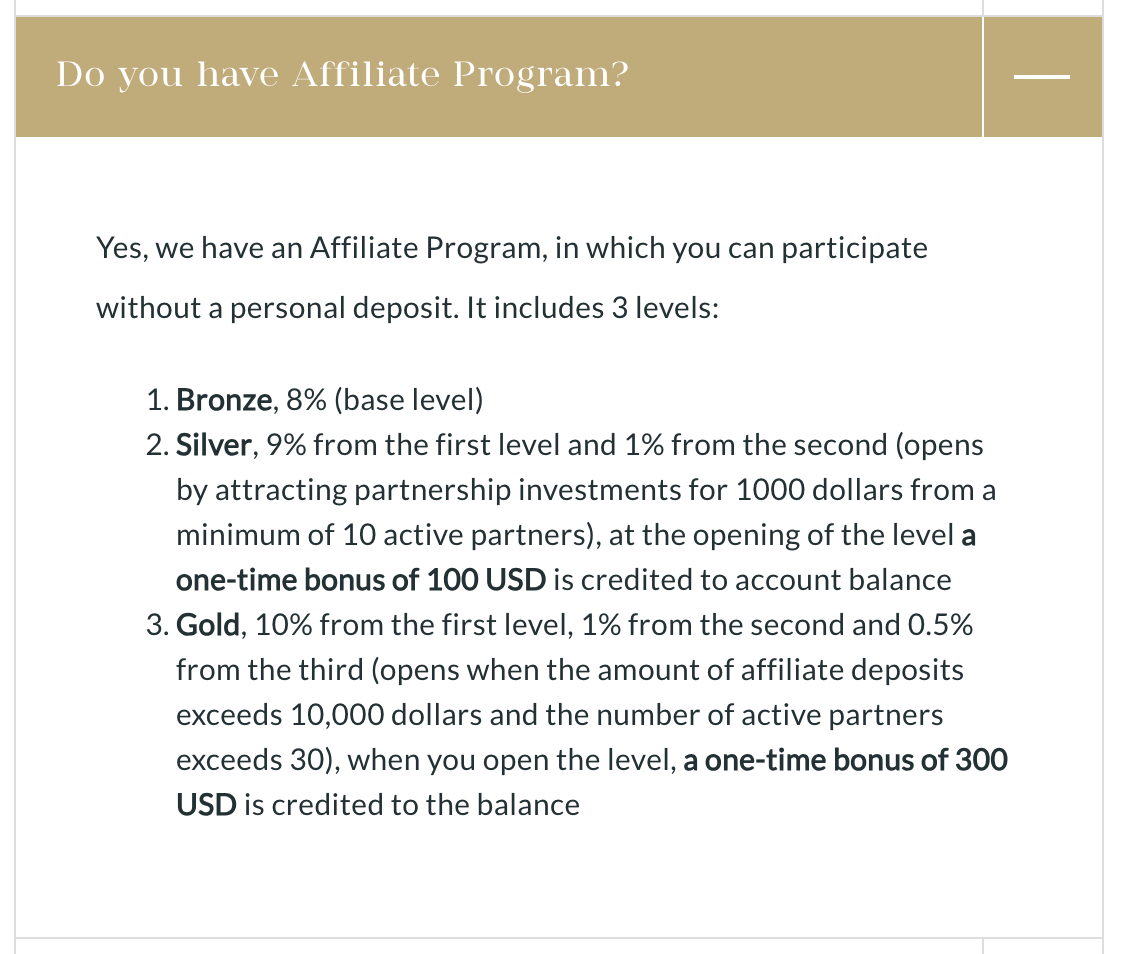 • Золото — выплаты составляют 10% от рефералов 1 уровня, 1% — второго, 0,5% — третьего. Этот статус рефоводы получают в случае привлечения инвестиций в размере от $10 тыс. и 30 клиентов. Единовременный бонус целых $300.