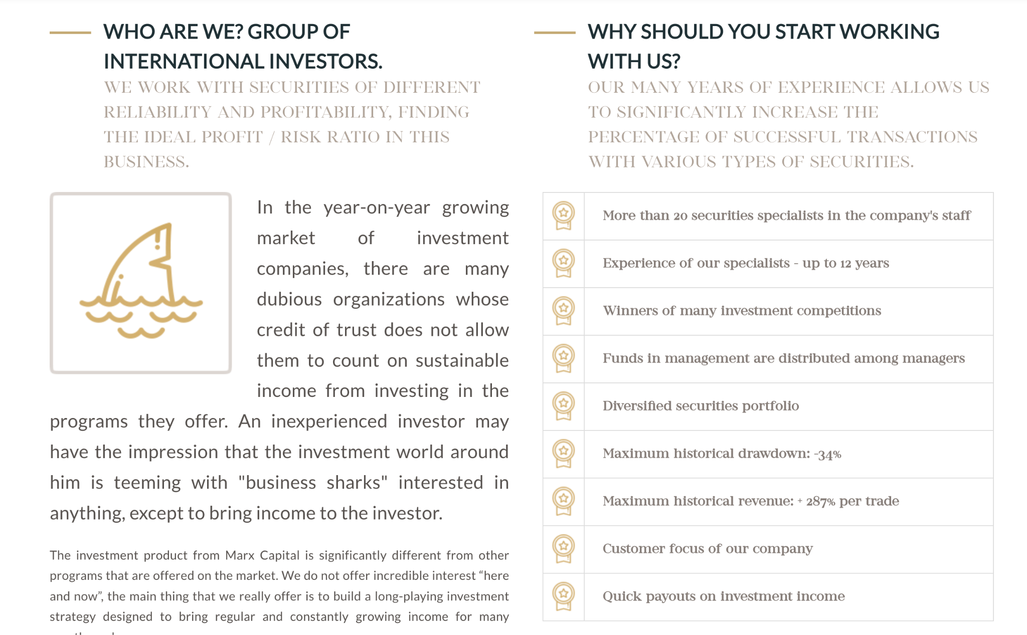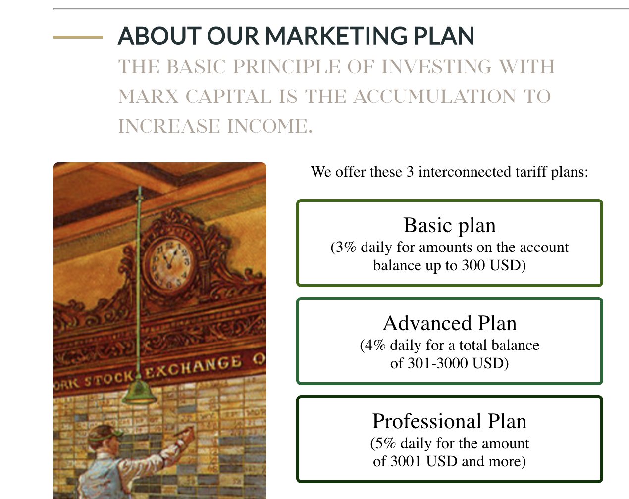 Marx Capital, если верить организаторам, был создан группой международных инвесторов. Они сообщали, что управляли капиталами клиентов, приобретая на них различные ценные бумаги. Такая диверсификация действительно полезна и позволяет зарабатывать прибыль, но при этом не рисковать потерей средств.