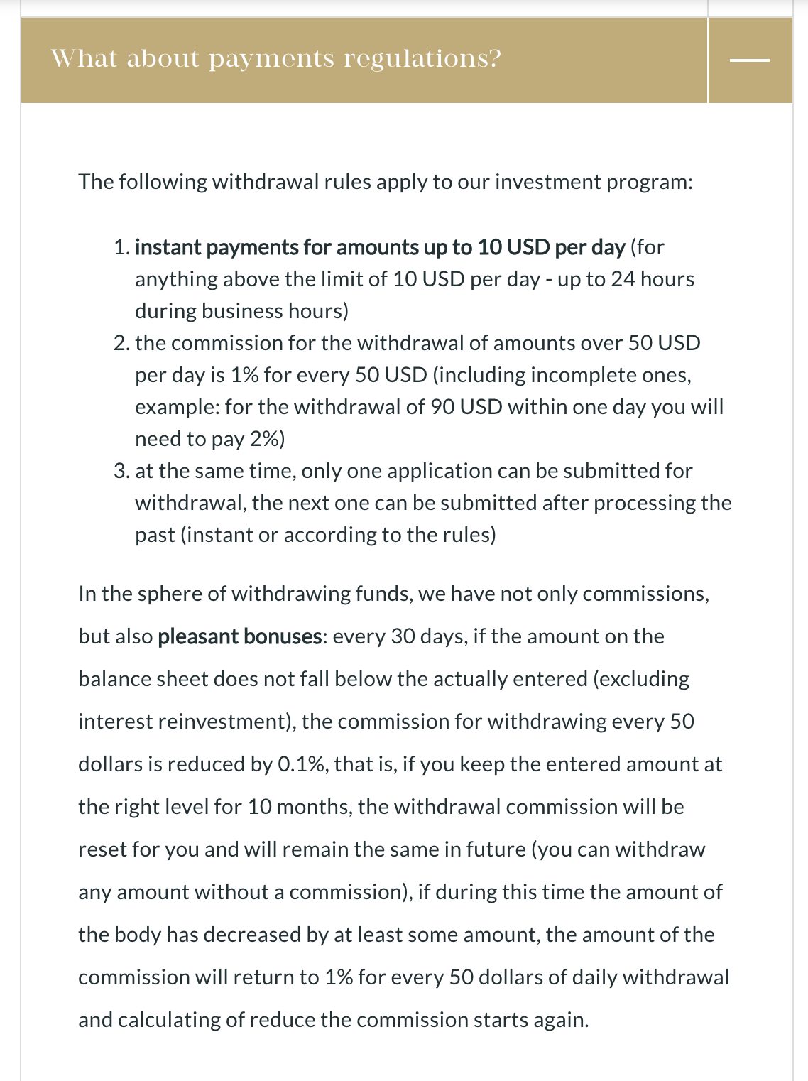 Организаторы пытались подсластить пилюлю и говорили, что за каждые 30 дней нахождения на балансе суммы в размере или больше первоначального депозита комиссии будут уменьшаться на 0,1%. То есть, чтобы получить скидку хотя бы в размере 1%, нужно было держать деньги не менее 10 месяцев. Если тело депозита уменьшиться хотя бы на $1, счетчик сбросится.