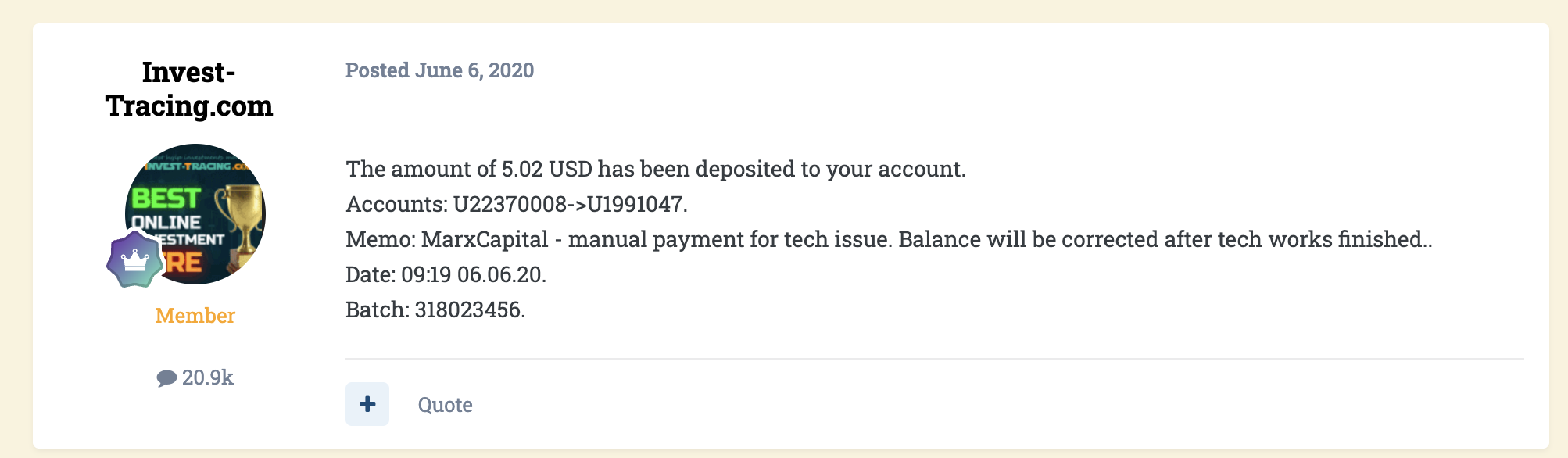 Назвать такие посты доказательством реальной работы конторы невозможно. Размер платежей не превышает $11, что полностью вписывается в описанную выше схему ограничений на выплату. Но очевидно, что с учетом роста капитала на 5% пользователь не успевал бы забрать свой доход без огромных комиссий.