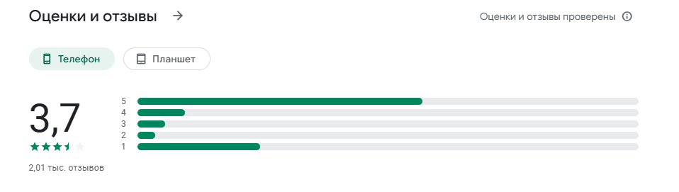 У приложения в Play Маркете средний рейтинг среди пользователей 3.7, что можно считать довольно низким показателем.