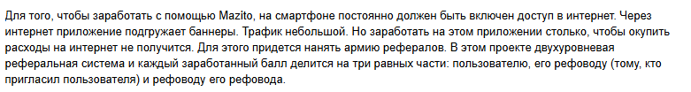 По данным из Интернета, заработать большие деньги на платформе Mazito ru не получится. Активным клиентам также предлагали двухуровневую партнерскую программу. Награда за активность рефералов поровну делится между сервисом, партнерами первого и второго порядка.