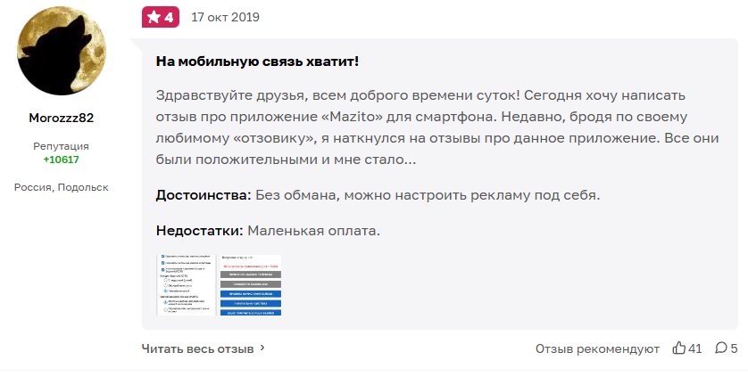 Пользователь с никнеймом Morozzz82 пишет, что показ рекламы можно настроить под себя, администрация Mazito работает без обмана и стабильно платит. При этом он отметил минимальную награду за работу.