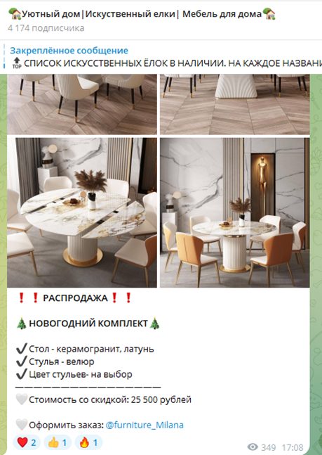 Мы не рекомендуем приобретать мебель и декор в магазине «Уютный дом Искуственный елки Мебель для дома». Проект не предоставляет никаких официальных гарантий получения товара покупателями, легальность работы не подтверждена, нет никаких контактных данных кроме Телеграма менеджера, реальных отзывов тоже нет. Риск потратить деньги и не получить товар огромен.