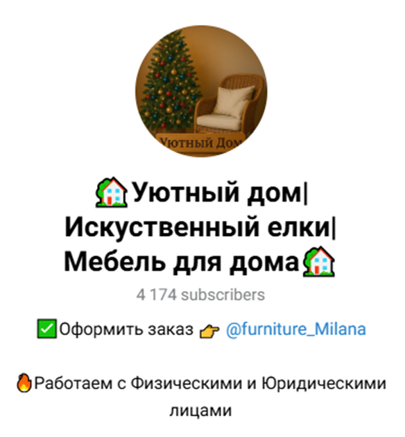 Телеграм-магазин «Уютный дом Искуственный елки Мебель для дома» предлагает своим подписчикам товары в следующих категориях: