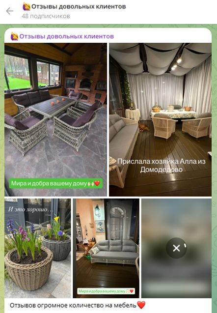 Отзывы публикуются на канале в формате фото, якобы из интерьеров их новых владельцев с подписями кто и откуда приобрел данные товары. Несложно догадаться, что подлинность таких «отзывов» сомнительна. Ничего не стоит взять фото из фотостоков и наложить на них текст. Тем более ссылок на аккаунты покупателя владельцы магазина не оставляют.