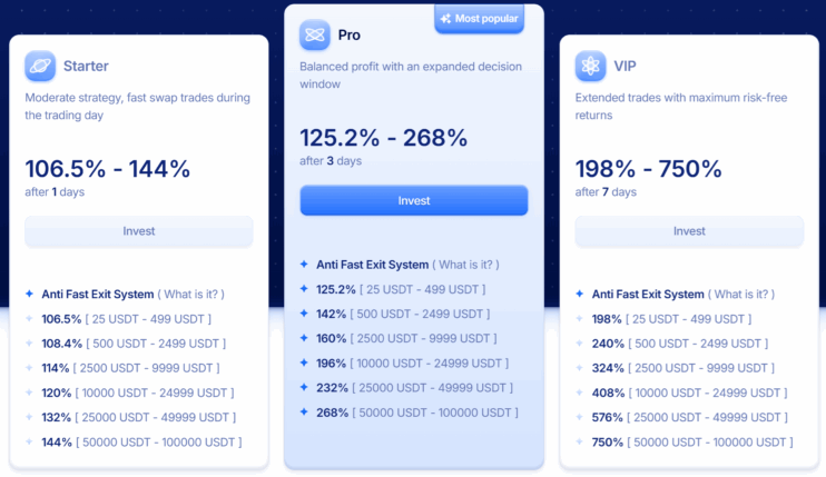 Доходность планов выглядит довольно агрессивно. Некоторые предложения обещают рост депозита на десятки или даже сотни процентов всего за несколько дней. В рекламных материалах такие цифры объясняются работой ИИ, который якобы анализирует крипторынок и автоматически открывает прибыльные сделки.