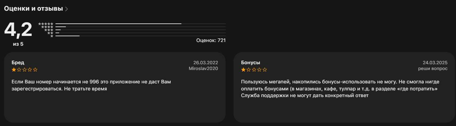 В App Store, к примеру, рейтинг проекта составляет 4,2, а немалая часть юзеров оценила программу именно на 1 балл. В своих комментариях эти люди пишут, что не могут зарегистрироваться из-за проблем с номером. Некоторые утверждают, что не могут использовать накопленные бонусы.