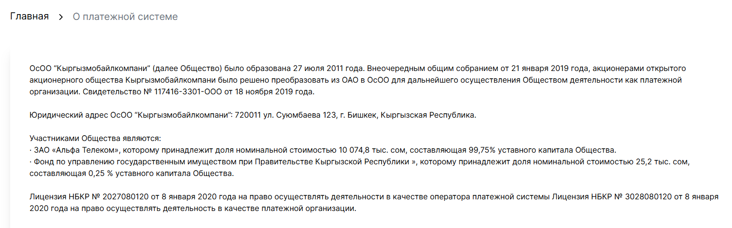 В разделе “О платежной системе” мы ожидали увидеть еще больше информации о том, как все устроено. На деле тут размещены только юридические данные, благодаря которым мы еще раз убеждаемся, что компания работает в Кыргызстане.