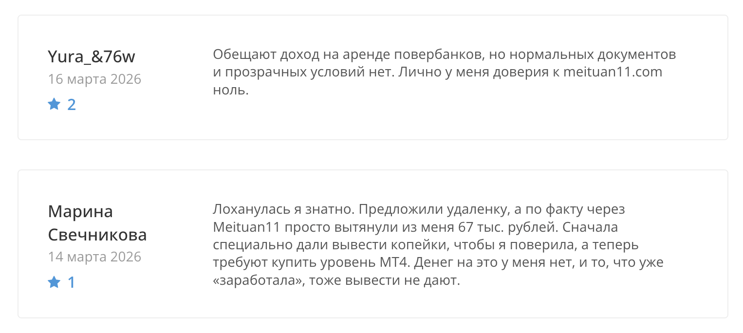 На просторах сети интернет встречаются реальные отзывы о сервисе Мейтуан 11 сом. В них клиенты пишут о своих разочарованиях в проекте: сначала обещают доход и удаленную работу, затем просто забирают средства и игнорят. Часть пользователей отмечает возможность небольших выплат на старте, тогда как другие рассказывают о сложностях с выводом средств и требованиях дополнительных пополнений баланса.