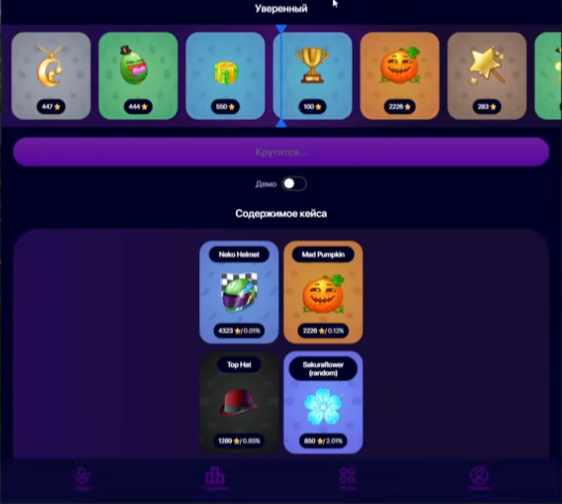 Основная деятельность мини-приложения в мессенджере – платная лотерея с различными подарками. В рамках проекта пользователи могут выбрать кейс от 150 звезд, открыть его и рандомно получить приз на выбор. Открытие даже самого дешевого кейса в боте Mell Gifts может принести пользователю звезды, анимированные эмодзи, подписки, открытки или стикеры Телеграма.