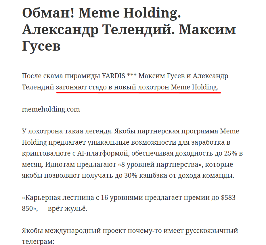 Отклики о проекте Меме холдинг немногочисленные. Пользователь сообщает, что раскрутка нового лохотрона ведется от имени опытных аферистов Александра Телендия и Максима Гусева. Ранее упомянутые персонажи продвигали скам Yardis.