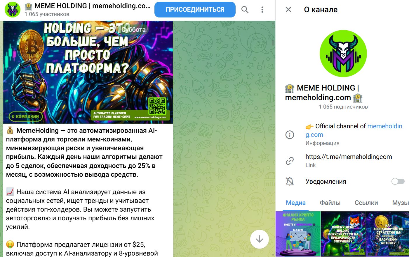 В Telegram канале @ memeholdingcom состоит около 1000 участников, но количество просмотров записей резко контрастирует с данным показателем. Реальная аудитория не превышает сотни фолловеров. Комментарии открыты, однако активность низкая. Своими мнениями к новостям проекта никто из клиентов не делится, а смайл-реакции доступны только положительные.