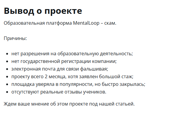 Отзывы о школе MentalLoop отсутствуют. Проект существует недавно и не набрал значительного количества участников или упоминаний. Вместо этого начали появляться статьи, где авторы подчеркивают отсутствие прозрачности и признаки обмана.