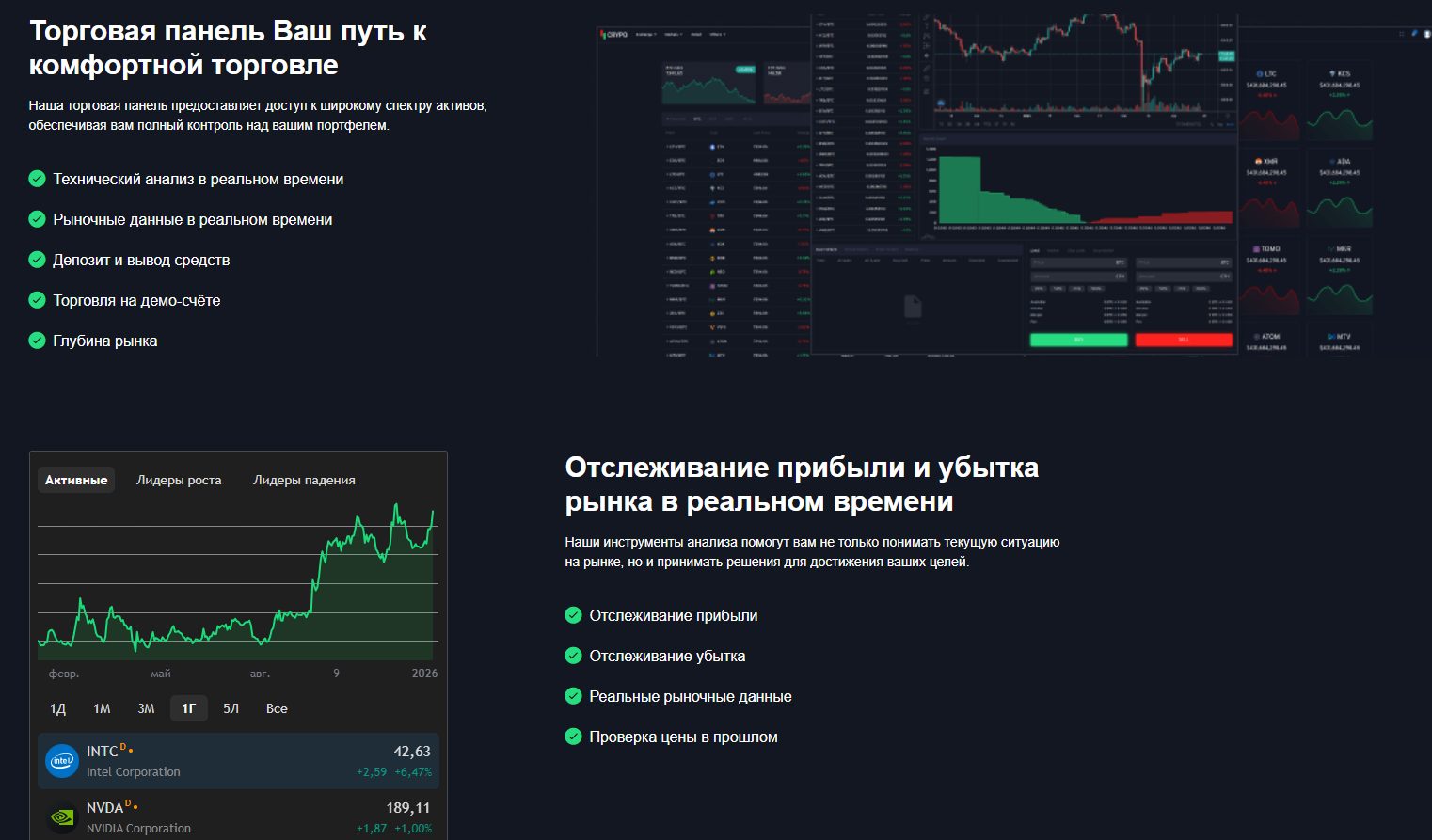 • Торговая панель. По сути это авторский терминал для трейдинга, который, по заявлениям на сайте, дает доступ к активам, демо-счет и встроенную помощь с техническим и фундаментальным анализами.