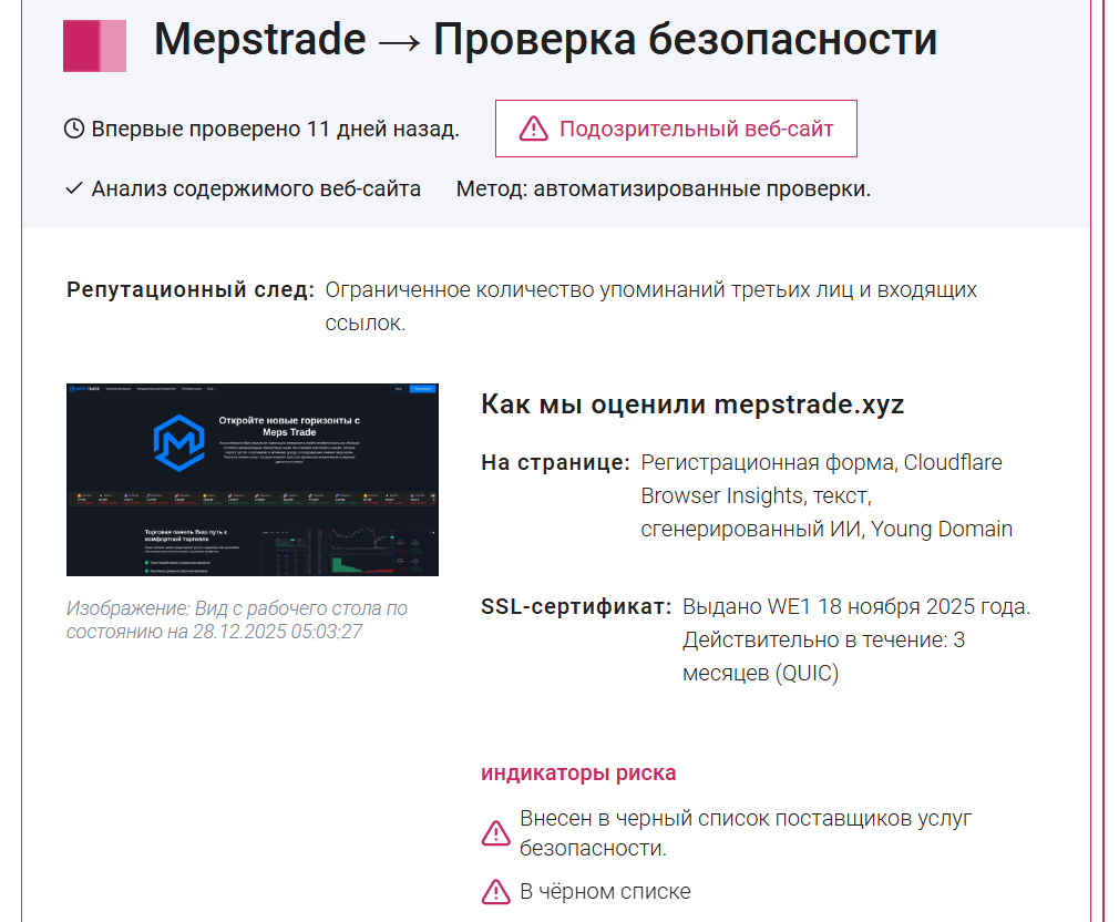 • Проект запущен совсем недавно и на январь 2026 года уже менял домены, так что для клиентов «Мепс Трейд» есть риск его быстрого закрытия или перезапуска под новым именем.