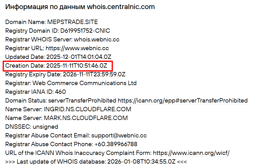 При этом, имена основателей платформы и наставников нигде не упоминаются, а сервис Whois показывает, что запущена работа «Мепс Трейд» лишь в ноябре 2025 года. Все данные регистранта скрыты.