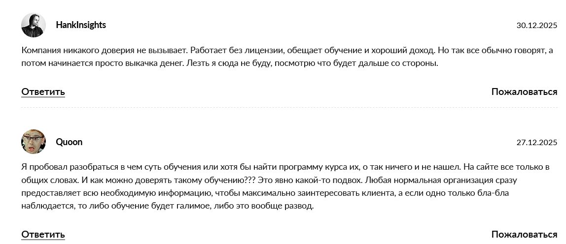 Люди указывают на то, что компания работает без лицензии, доверия она не вызывает. Обучения трейдингу здесь нет, а все обещания высокой прибыли фейковые.