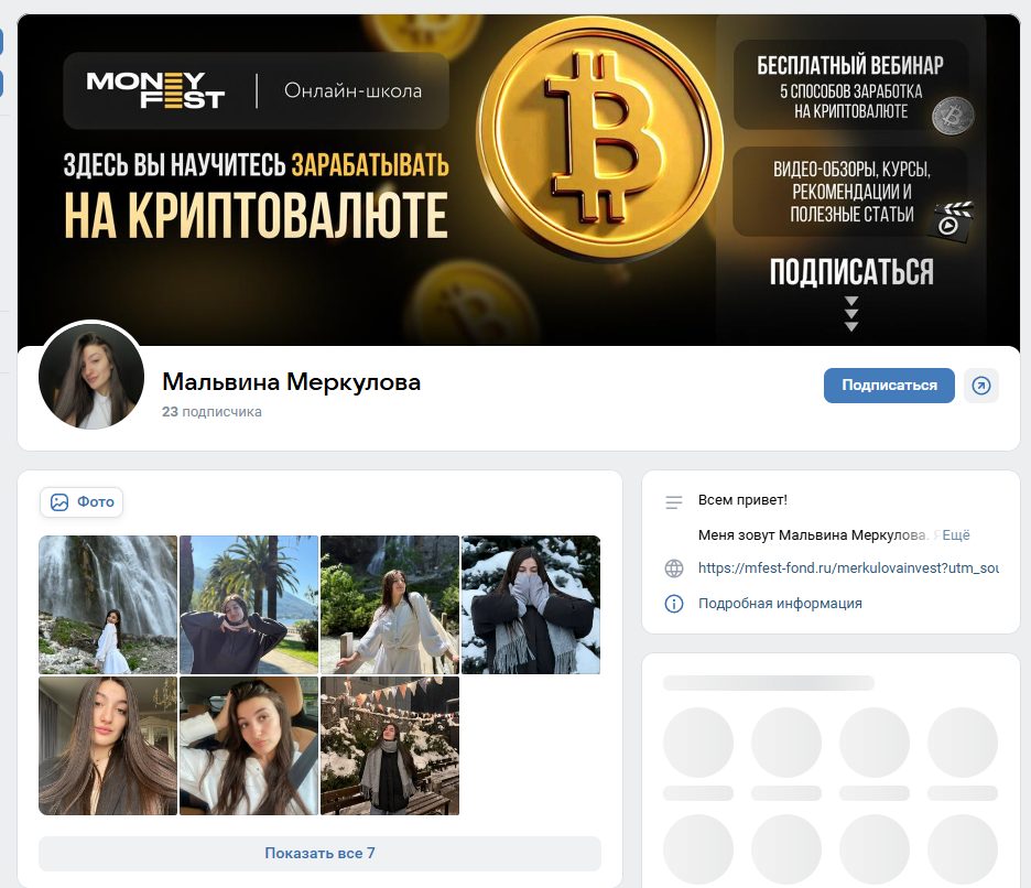У Меркуловой есть собственная страница во ВКонтакте. Там всего 23 подписчика. На ней девушка предлагает клиентам бесплатный вебинар 5 способов заработка на криптовалюте. Остальной контент – это красивые фотографии и краткая презентация о криптоаналиике.