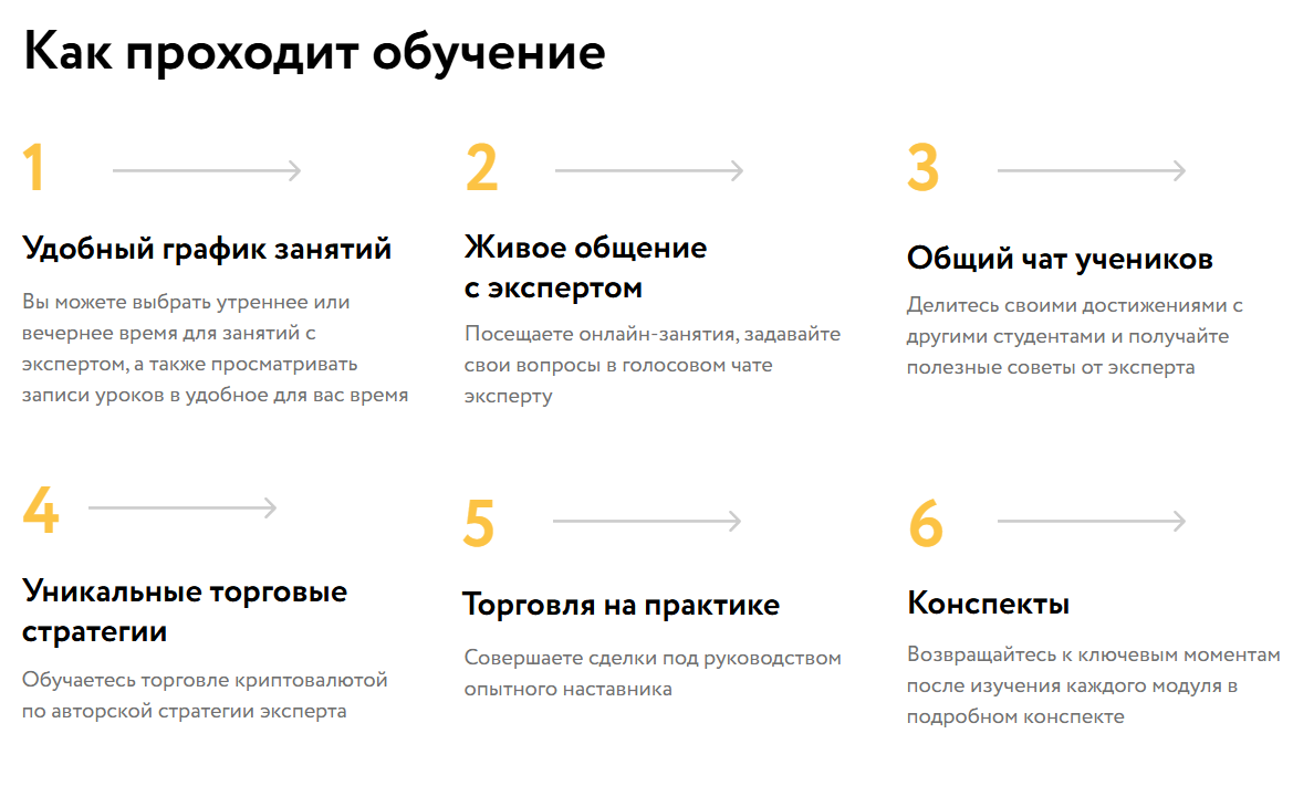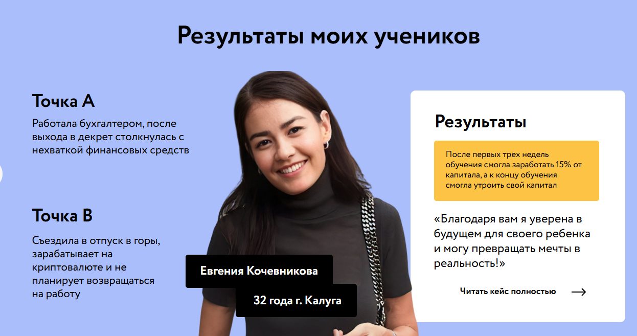При этом потенциальным ученикам следует учитывать, что торговля криптовалютами связана с высоким уровнем финансовых рисков. Даже при прохождении обучения результат зависит от рыночной ситуации и личных навыков трейдера.
