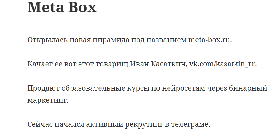 Покупать курсы «Мета Бокс ру» мы не советуем из-за обвинений в организации пирамиды и отсутствии реальных гарантий.