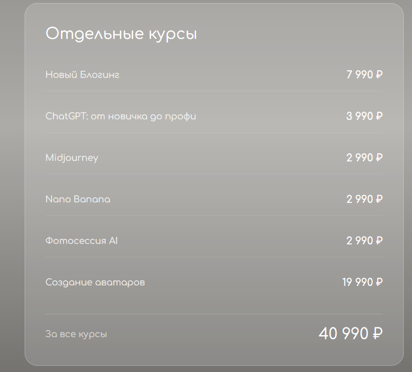 «Метабокс ИИ» предлагает множество различных видов обучения. Курсы отличаются по стоимости, например обучение ИИ-фотосессиям или использованию таких нейросетей как Nana Banana и Midjourney стоит ₽2,990. Курс по блоггингу обойдется в ₽7,990, а обучение использованию ChatGPT – ₽3,990. Создавать аватары обучат за ₽19,990, но точных данных о содержании любых курсов не приводят. Все курсы можно купить за ₽40,990.