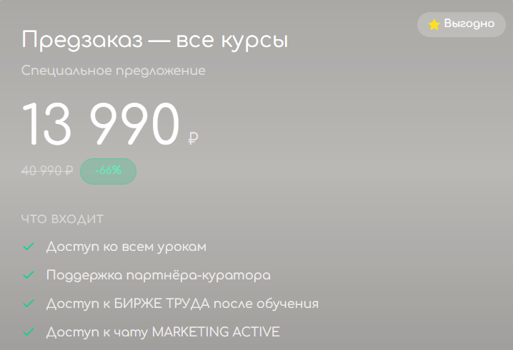 При предзаказе всего обучения можно получить скидку в 66%. Участники получат доступ к бирже труда, поддержку и доступ к чату и всем урокам проекта за ₽13,990.
