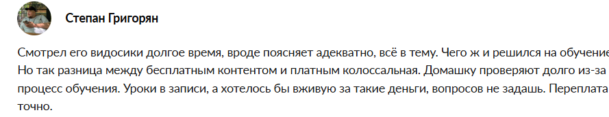 В некоторых отзывах клиенты пишут, что видеоролики автор публикует адекватные и оценивают их скорее положительно. В то же время пишут, что задания участников проверяют долго, уроки предоставляют в записи, задавать вопросы нельзя.