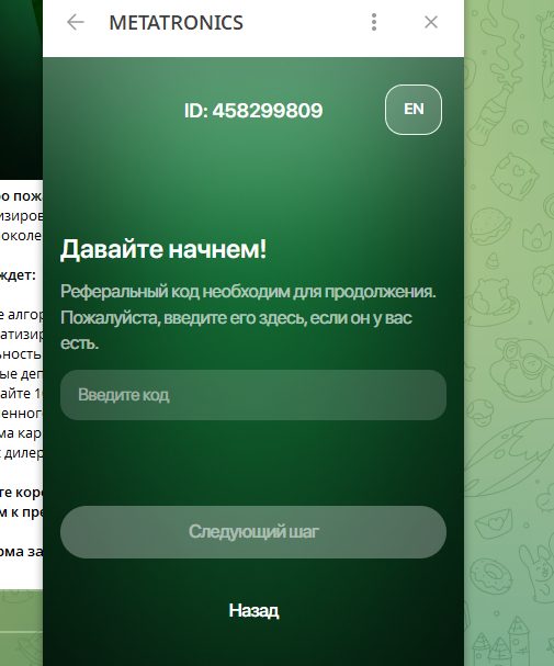 Не имея реферального кода, приступить к заработку не получится. А обещает ТГ приложение Metatronics следующее: