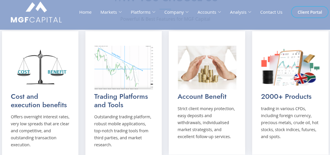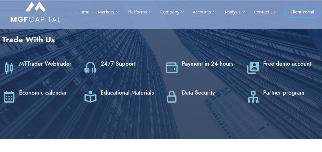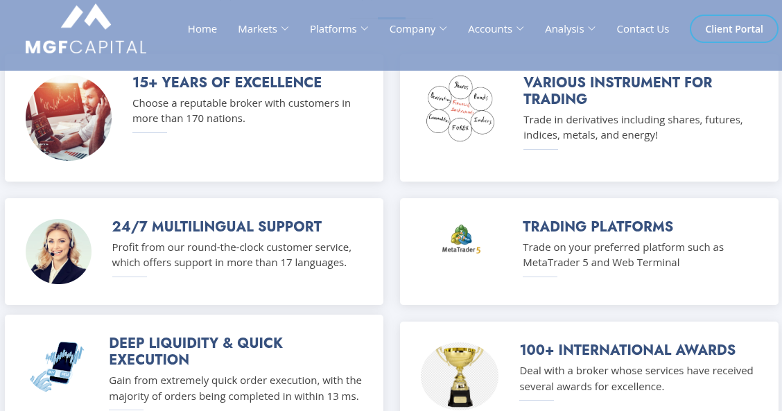 В последнем блоке преимуществ MGF Capital com команда уделила внимание общим аспектам деятельности финансовой компании. В этой части создатели первым делом отметили опытность в более 15 лет и деятельность в более 170 странах. Для диверсификации пользователи могут использовать разные инструменты, как контракты CFD, так и фьючерсы или опционы.