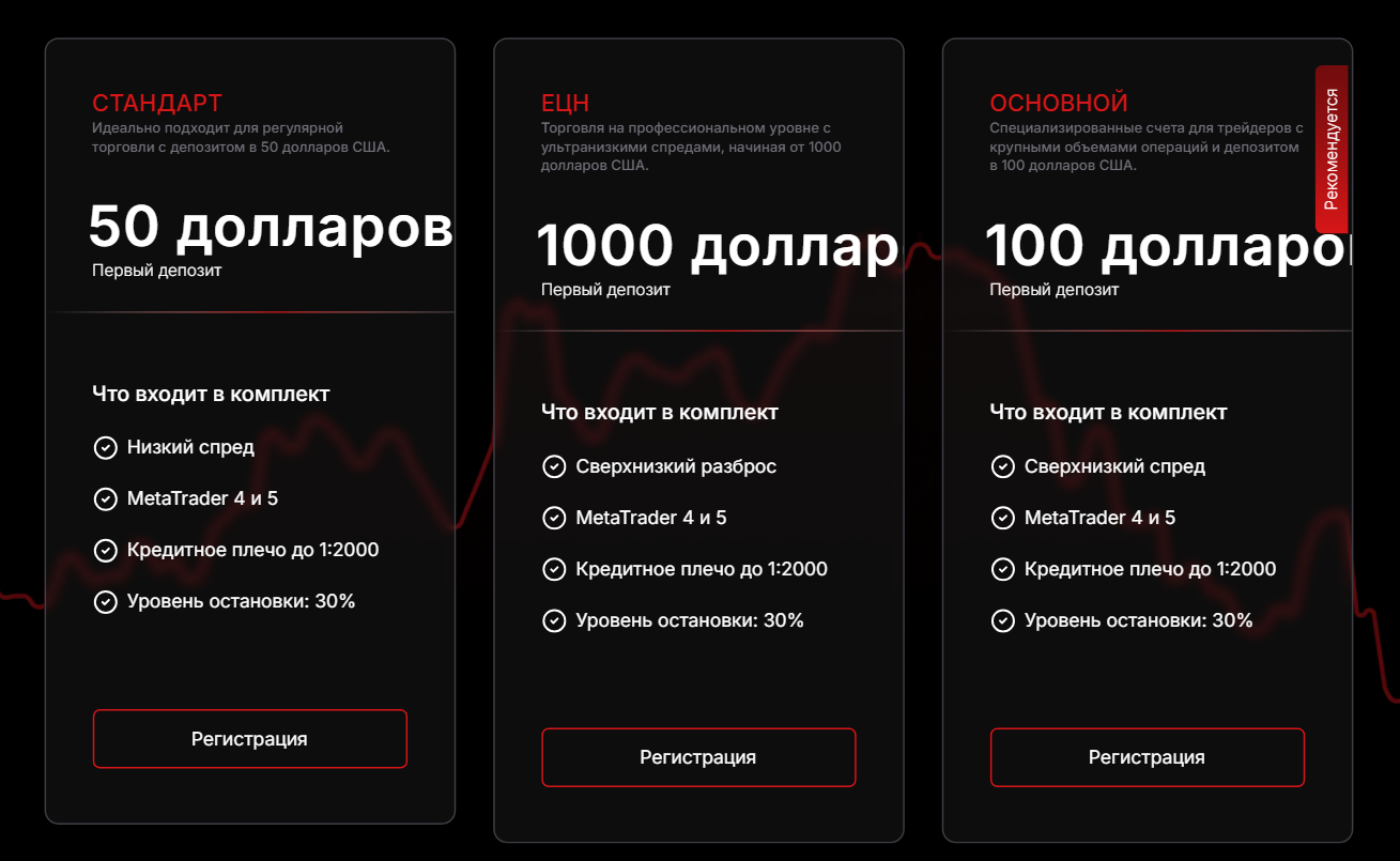 Торговать на этой платформе можно через популярные терминалы MetaTrader 4 и MetaTrader 5. Чтобы приступить к сделкам, нужно зарегистрироваться на сайте и выбрать тариф:
