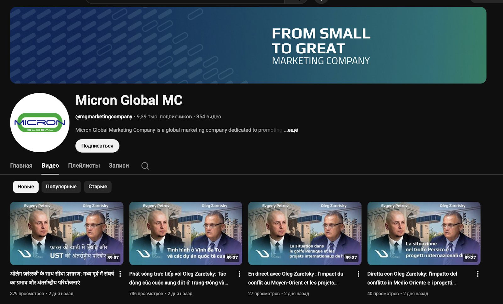 Плюс у проекта есть профили «Микронглобал ком» в Facebook, LinkedIn, а также YouTube-канал Rswsystemsl6816 с роликами на разных языках. Аудитория у канала, как и у всей платформы в целом, скромная. В роликах двое мужчин в костюмах говорят на серьезные темы и рассказывают, как Micron решит проблемы мирового уровня.