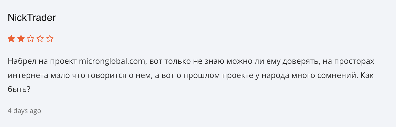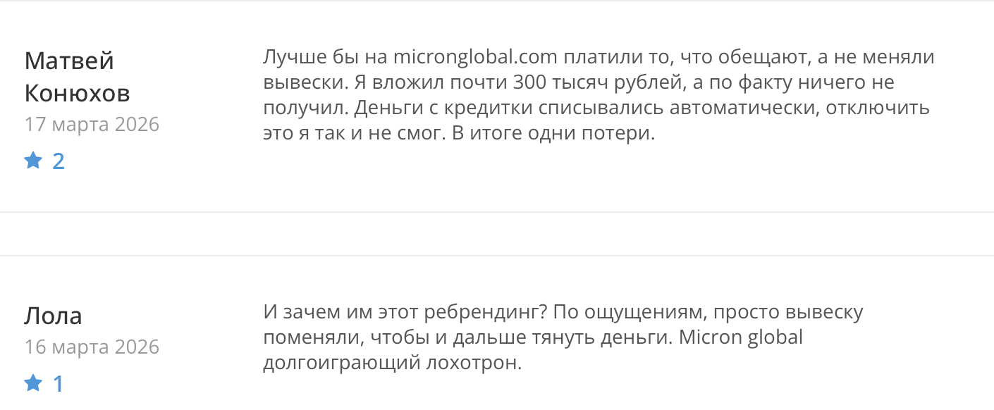 Если сложить все пазлы воедино, компания Micron Global доверия не внушает. Против нее говорят негативные отзывы, ложные сведения и отсутствие финансовой регуляции. По сути, это полностью фейковая контора, пережившая «ребрендинг».